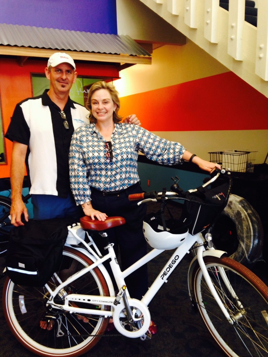 Irvine Community Services Commissioner Melissa Fox with Irvine Pedego Electric Bicycle owner Bob Bibee