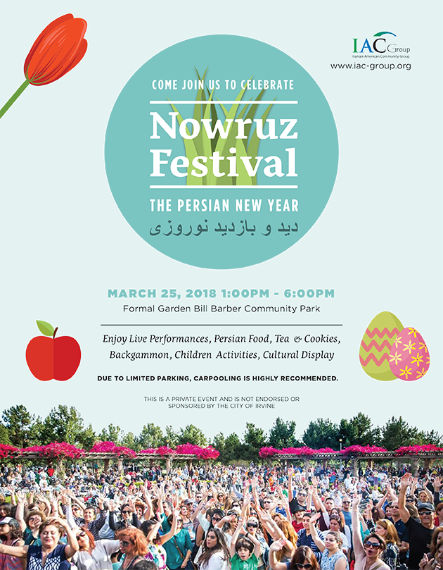 One of our biggest cultural celebrations is the annual Persian New Year (Nowruz) Festival, taking place this year on Sunday, March 25, 2018, from 1:00 pm – 6:00 pm at Irvine’s Bill Barber Community Park, sponsored by the Iranian-American Community Group Orange County.