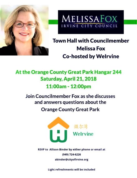 Please join me for an Irvine Town Hall Meeting on Saturday, April 21, starting at 11:00 a.m., at the Great Park.