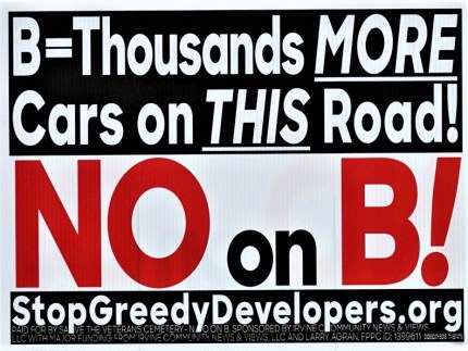 Sign used by opponents of Measure B, warning that passage of Measure B would mean thousands more cars on every road in Irvine.