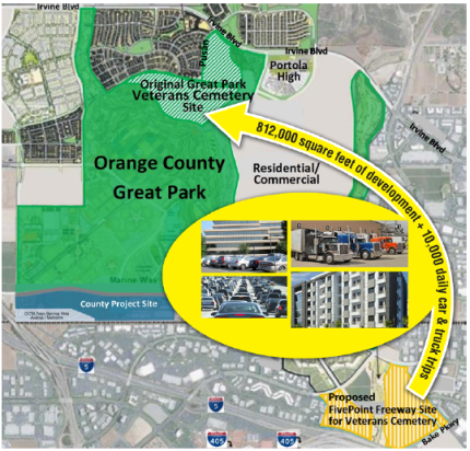 Looking at the specific language of Measure B, what the voters said No to was “allowing the previously planned development for the Bake Parkway Site to be relocated to the intersection of Pusan and Irvine Blvd and allowing the development of a veterans cemetery near the intersection of I-5 and Bake Parkway.”
