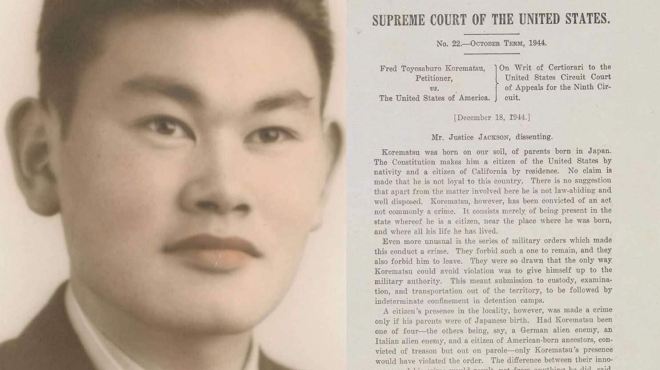 Dissenting Justice Robert H. Jackson, who later served as Chief US Prosecutor at the Nuremberg Trials, wrote that “Korematsu was born on our soil, of parents born in Japan. The Constitution makes him a citizen of the United States by nativity and a citizen of California by residence. No claim is made that he is not loyal to this country. There is no suggestion that apart from the matter involved here he is not law abiding and well disposed. Korematsu, however, has been convicted of an act not commonly a crime. It consists merely of being present in the state whereof he is a citizen, near the place where he was born, and where all his life he has lived. […] [H]is crime would result, not from anything he did, said, or thought, different than they, but only in that he was born of different racial stock. Now, if any fundamental assumption underlies our system, it is that guilt is personal and not inheritable. Even if all of one’s antecedents had been convicted of treason, the Constitution forbids its penalties to be visited upon him. But here is an attempt to make an otherwise innocent act a crime merely because this prisoner is the son of parents as to whom he had no choice, and belongs to a race from which there is no way to resign.”