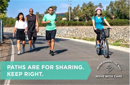 Irvine Shares the Way is a project to improve the safety of everyone in Irvine, whether they are walking, bicycling, or driving. Irvine Shares the Way is a broad-based campaign, including educational materials, safety workshops, and other activities across the City of Irvine.