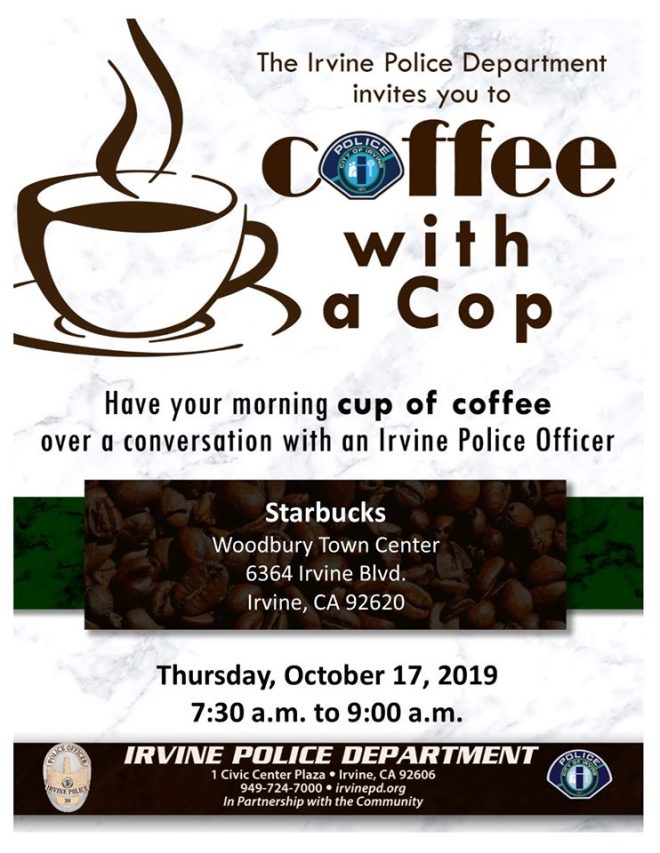 All Irvine residents are invited to “Coffee with a Cop” on Thursday, Oct. 17, 2019, from 7:30 to 9 a.m. at Starbucks at the Woodbury Town Center.