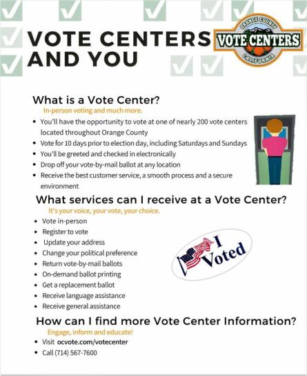 With Vote Centers, all registered voters in Orange County will receive a vote-by-mail ballot. Do you prefer to cast your ballot in person? No problem! Visit any Vote Center to cast your ballot in person. Find a list of all Orange County Vote Centers HERE.