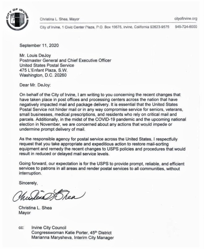 At the Irvine City Council meeting on September 8, 2020, the Council unanimously agreed to send an official letter to the U.S. Postmaster, on behalf of our residents, to cease and rescind any actions that undermine prompt delivery of the mail, including “expeditious action to re-store mail sorting equipment and remedy the recent changes to USPS polices and procedures that would result in reduced or delayed mail service levels.”