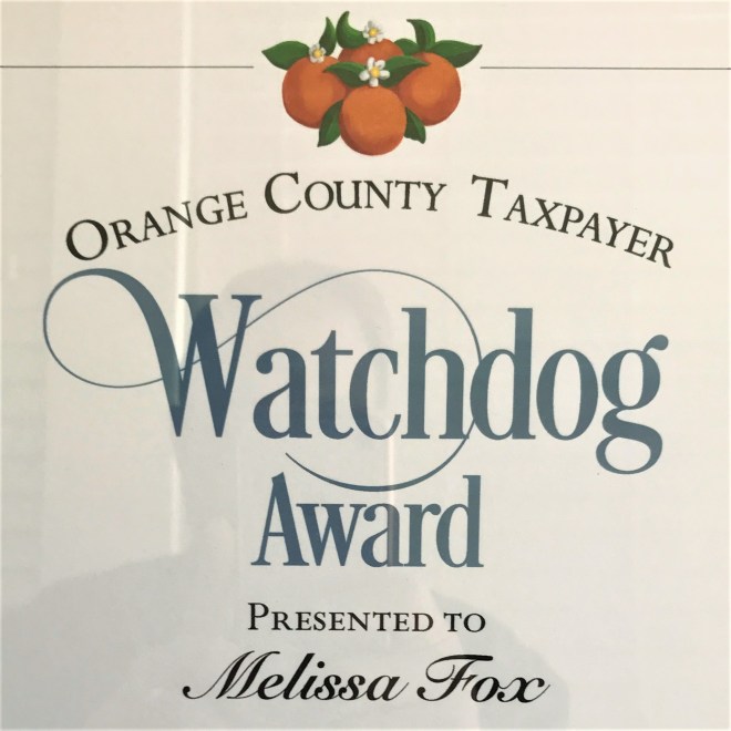 The Orange County Taxpayers Watchdog Award was for “demonstrating dedication to the protection of taxpayer funds and for the advocacy of government transparency and fiscal responsibility.”