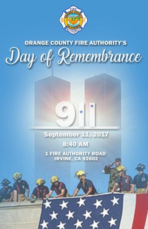 Please join me, the brave men and women of the Orange County Fire Authority (OCFA), and other members of the OCFA Board of Directors at a special “Day of Remembrance” Ceremony at OCFA Headquarters in Irvine, honoring those lost on September 11, 2001.