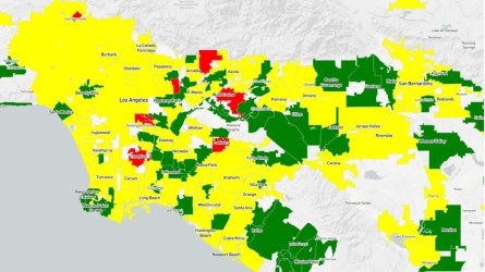 A map created by the state auditor’s office ranks cities by fiscal health. Green is low risk, yellow is moderate risk and red is high risk.
